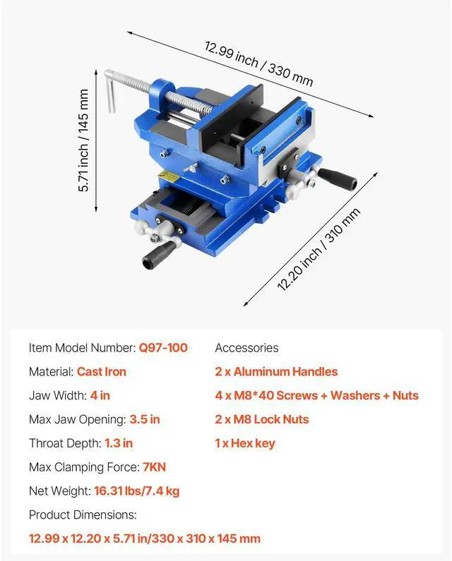 Jaw Width: 4 in,Max Clamping Force: 7KN,Max Jaw Opening: 3.5 in,Throat Depth: 1.3 in,Item Model Number: Q97-100,Material: Cast Iron,Product Dimensions: 12.99 x 12.20 x 5.71 in/330 x 310 x 145 mm,Net Weight: 16.31 lbs/7.4 kg