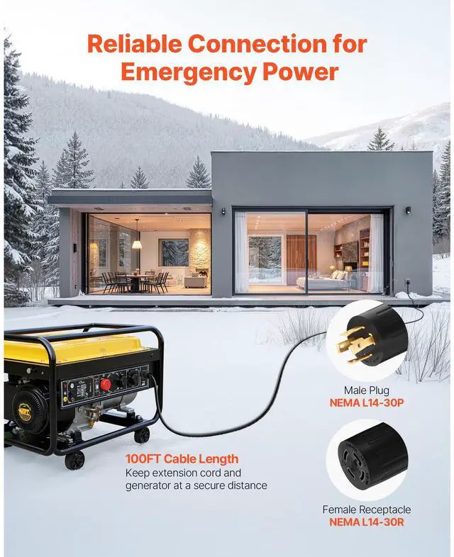 VEVOR 30 Amp Generator Cord and Power Inlet Box, 100 FT, 125/250V NEMA L14-30P to L14-30R Heavy Duty Extension Power Cord, SJTW 10AWG 7500W, Pre-Drilled Inlet Box, for Generator to House, ETL Listed