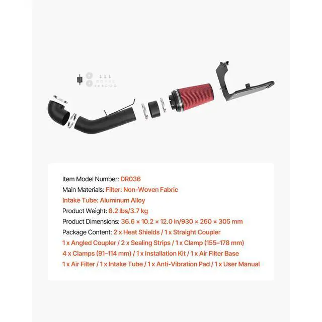 Item Model Number: DR036,Product Weight: 8.2 lbs/3.7 kg,Filter Material: Non-Woven Fabric,Intake Tube Material: Aluminum Alloy,Product Dimensions: 36.6 x 10.2 x 12.0 in/930 x 260 x 305 mm