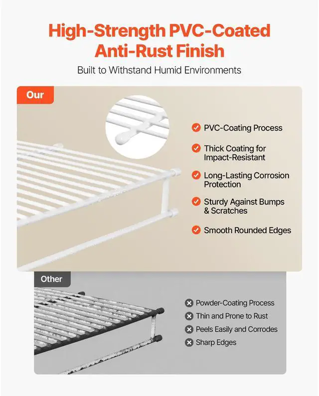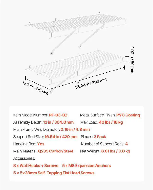 Number of Support Rods: 4,Max Load: 40 lbs/18 kg,Hanging Rod: Yes,Main Frame Wire Diameter: 0.19 in/4.8 mm,Item Model Number: RF-03-02,Support Rod Size: 16.54 in/420 mm,Product Dimensions (L x W x H): 35.04 x 12.2 x 1.97 in/890 x 310 x 50 mm,Assembly Depth: 12 in/304.8 mm,Net Weight: 6.61 lbs/3.0 kg,Metal Surface Finish: PVC Coating,Main Material: Q235 Carbon Steel,Pieces: 2 Pack