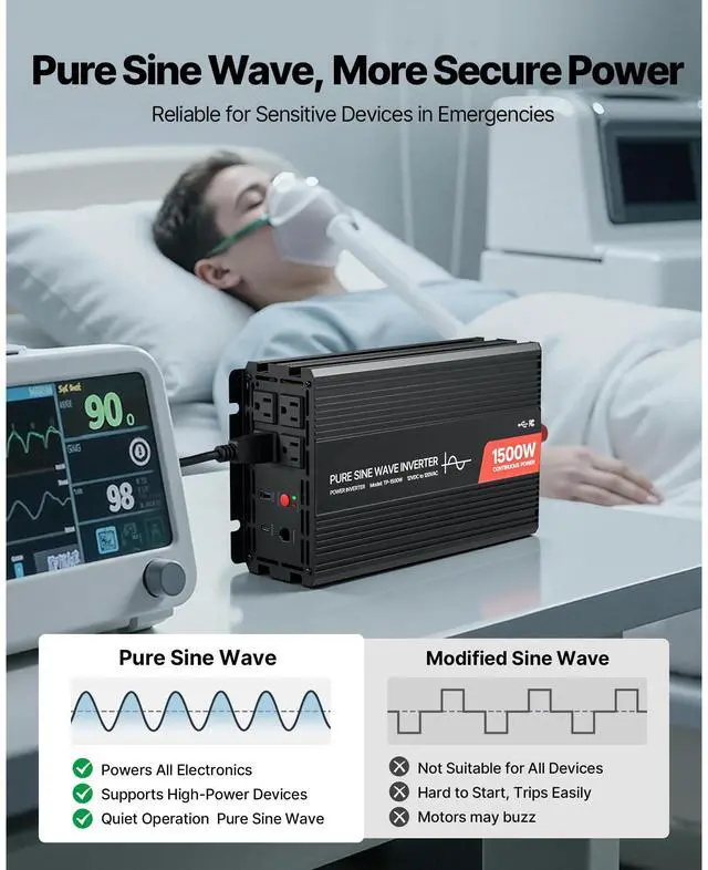VEVOR 1500W Power Inverter, 12V DC to 120V AC Pure Sine Wave Inverter, Car Charger Converter with Remote Control, USB & Type-C Ports, 4 AC Outlets, Fast-charging for RV, Truck Outdoor Camping
