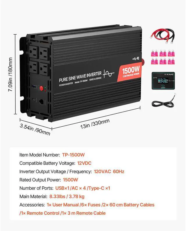 Compatible Battery Voltage: 12VDC,Number of Ports: 1 x USB; 4 x AC; 1 x Type-C,Rated Output Power: 1500W,Item Model Number: TP-1500W,Item Dimensions: 13 x 7.09 x 3.54 in / 330 x 180 x 90 mm,Inverter Output Voltage / Frequency: 120VAC 60Hz,Net Weight: 8.33 lbs / 3.78 kg,Main Material: Aluminum Alloy