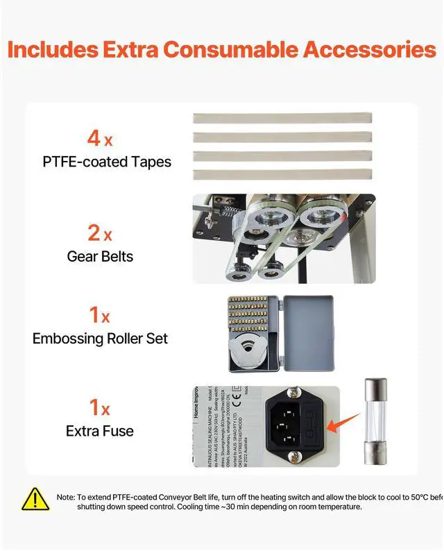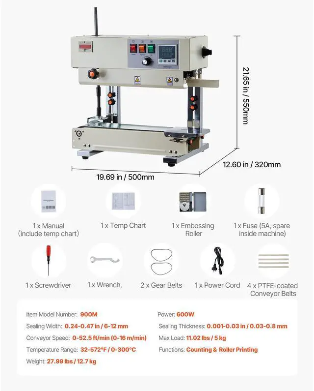 Max Load: 11.02 lbs / 5 kg,Sealing Width: 0.24-0.47 in / 6-12 mm,Sealing Thickness: 0.001-0.03 in / 0.03-0.8 mm,Conveyor Speed: 0-52.5 ft/min (0-16 m/min),Item Model Number: 900M,Temperature Range: 32-572 / 0-300,Functions: Counting & Roller Printing,Dimension: 19.6 x 13 x 21.3 in / 498 x 330 x 540 mm,Net Weight: 28 lbs / 12.7 kg,Power: 600W