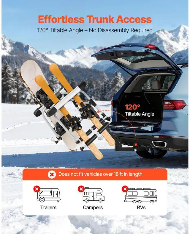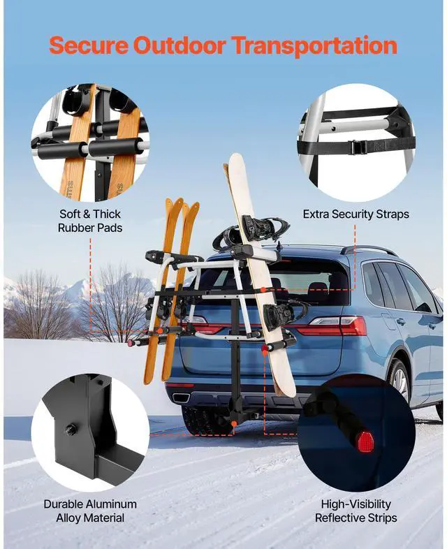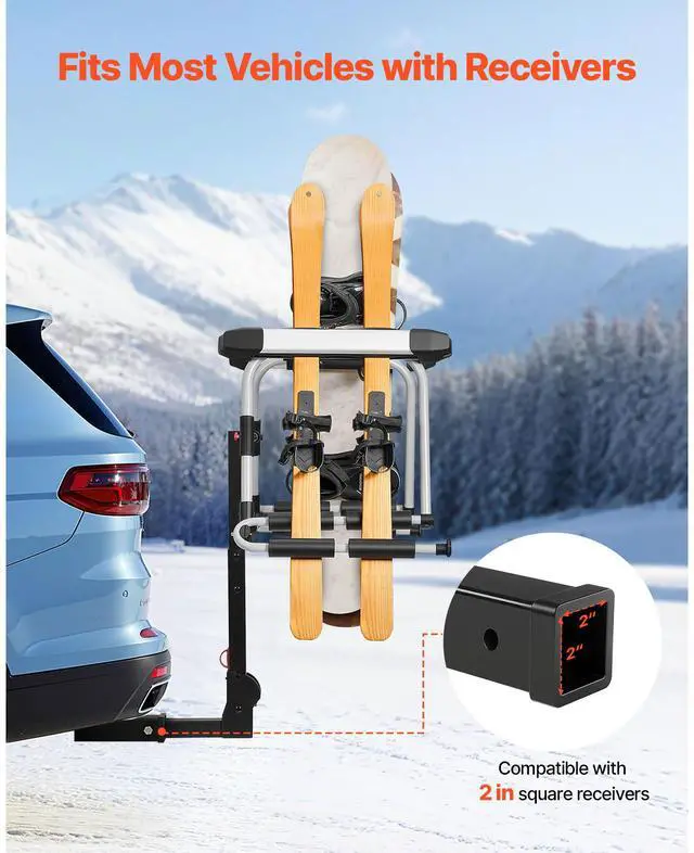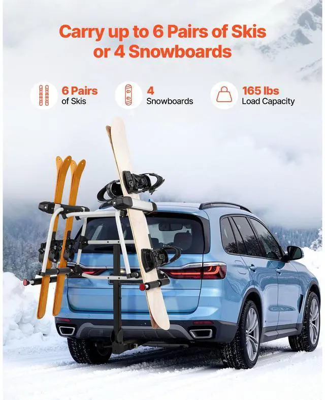 • VEVOR Hitch Mounted Ski & Snowboard Rack, Fits 2-Inch Receiver, Carries up to 6 Pairs of Skis or 4 Snowboards, Hitch-Mounted Rack for Car with Key Lock, Security Strap, Tilt Access, Rubber Padding