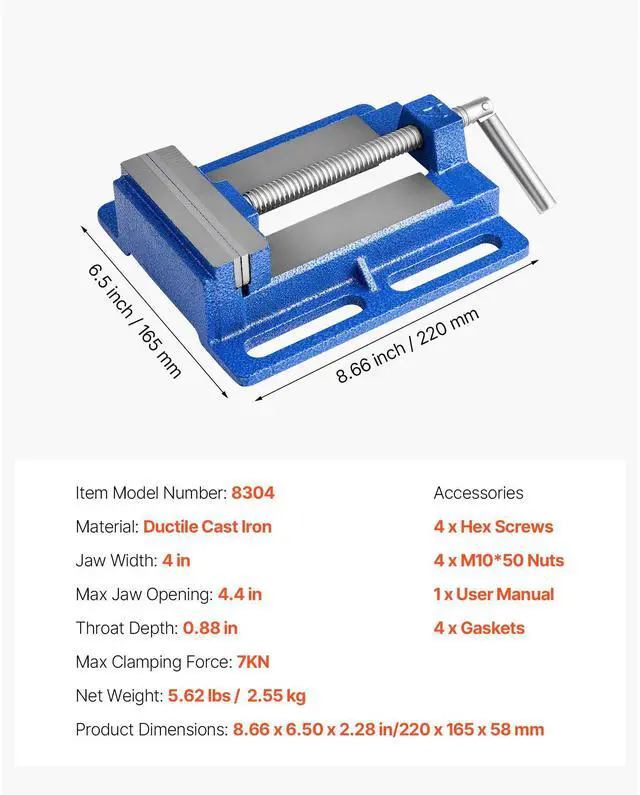 Jaw Width: 4 in,Max Clamping Force: 7KN,Max Jaw Opening: 4.4 in,Throat Depth: 0.88 in,Item Model Number: 8304,Material: Ductile Cast Iron,Product Dimensions: 8.66 x 6.50 x 2.28 in/220 x 165 x 58 mm,Net Weight: 5.62 lbs/2.55 kg