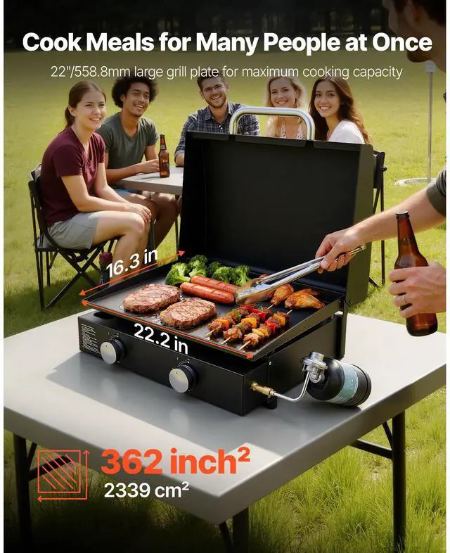 VEVOR Gas Griddle, 2 Burner Tabletop Griddle, 22 inch Portable Griddles Propane with Lid, Oil Drain Hole & Oil Collection Tray, 2 x 11000BTU Camping Flat Top Grill for Outdoor Cooking, Tailgating