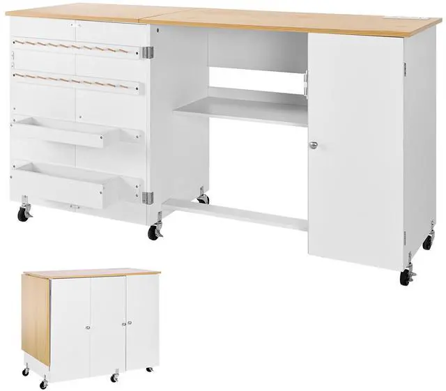 VEVOR Folding Sewing Table, Multipurpose Sewing Machine Table with Cabinet, Charging Station, Compact Design, Wheels, Wooden Pegs, Storage Trays and Shelf, Craft Station and Side Desk for Home