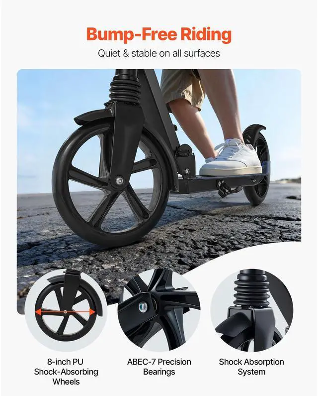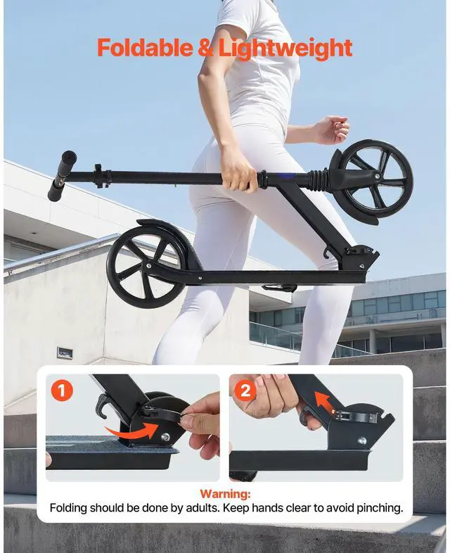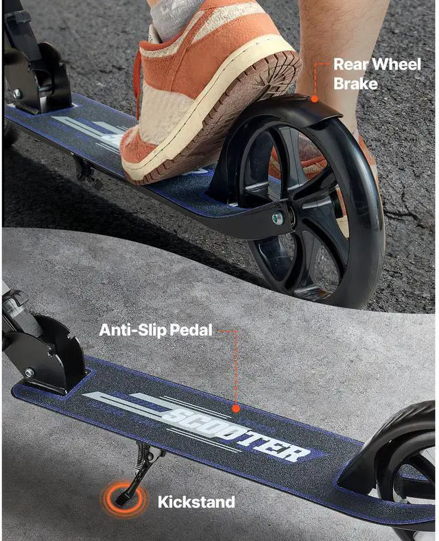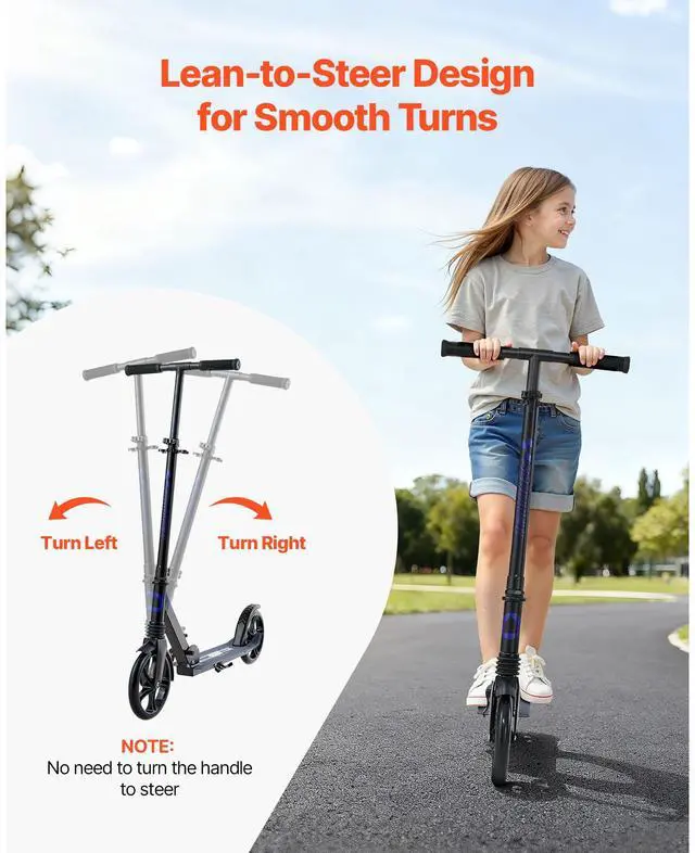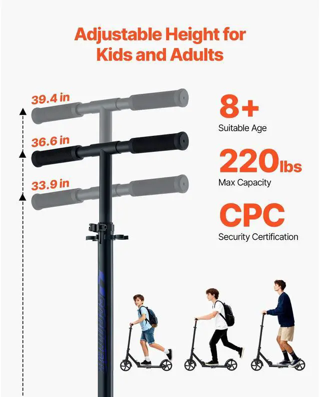VEVOR Kick Scooter for Kids Ages 8+, Teens & Adults, 2-Wheel Toddler Scooter with Adjustable Height Handlebar, Wide Anti-Slip Deck, Foldable Lightweight for Boys & Girls up to 220 lbs, Black + Purple