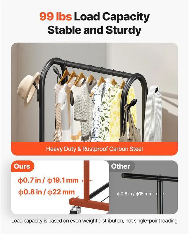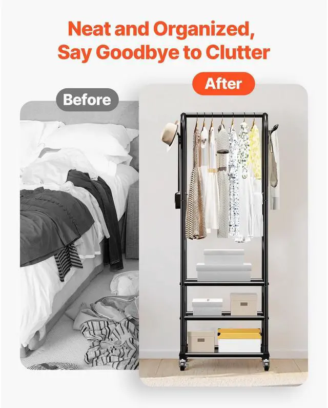 VEVOR Clothes Rack, Rolling Clothing Garment Rack with Hanging Rod and Side Hooks, 3 Storage Shelves, 99 lbs Load Capacity, Heavy Duty Carbon Steel Clothing Racks for Bedroom, Laundry, Living Room