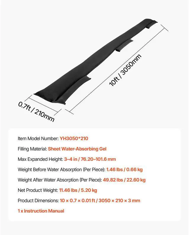 Net Product Weight: 11.46 lbs / 5.20 kg,Filling Weight: 0.98 lbs / 0.45 kg,Weight After Water Absorption (Per Piece): 49.82 lbs / 22.60 kg,Item Model Number: YH3050*210,Filling Material: Sheet Water-Absorbing Gel,Product Dimensions: 10 x 0.7 x 0.01 ft / 3050 x 210 x 3 mm,Weight Before Water Absorption (Per Piece): 1.46 lbs / 0.66 kg,Max Expanded Height: 34 in / 76.20101.6 mm,Water Absorption Capacity: 48.32 lbs / 21.92 kg