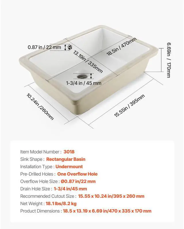 Overflow Hole Size: Ø0.87 in/22 mm,Recommended Cutout Size: 15.55 x 10.24 in/395 x 260 mm,Installation Type: Undermount,Pre-Drilled Holes: One Overflow Hole,Item Model Number: 3018,Product Dimensions: 18.5 x 13.19 x 6.69 in/470 x 335 x 170 mm,Net Weight: 18.1 lbs/8.2 kg,Sink Shape: Rectangular Basin,Drain Hole Size: 1-3/4 in/45 mm