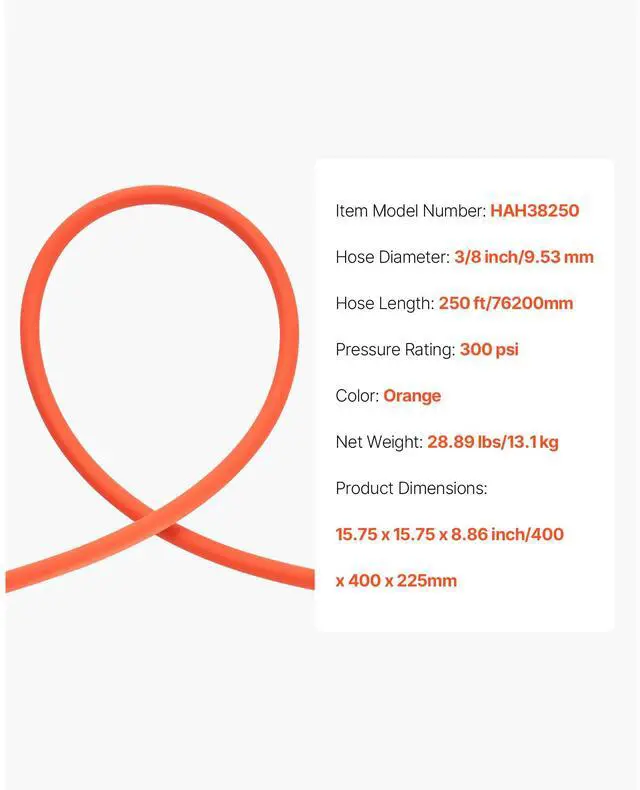 Hose Length: 250 ft/76200 mm,Color: Orange,Item Model Number: HAH38250,Pressure Rating: 300 PSI,Hose Diameter: 3/8 in/9.53 mm,Product Dimensions: 15.75 x 15.75 x 8.86 inch/400 x 400 x 225 mm,Net Weight: 28.89 lbs/13.1 kg