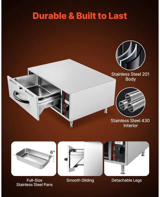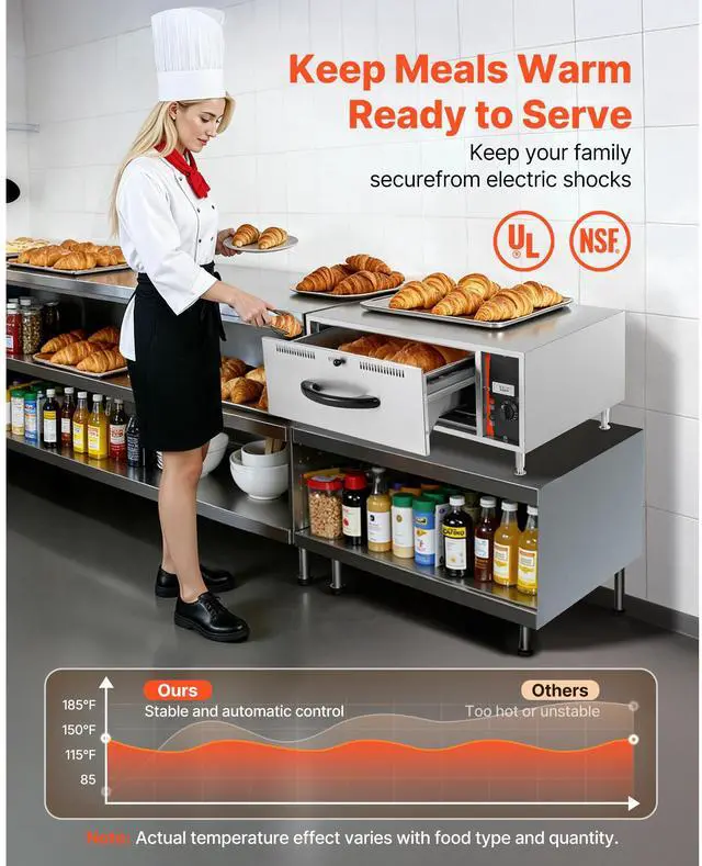 VEVOR Commercial Electric Drawer Warmer, Single-Drawer Stainless Steel Food Warmer, Freestanding Standard Warming Drawer Cabinet, 85°F185°F Wide Temperature Range, for Restaurant, Hotel & Bakery