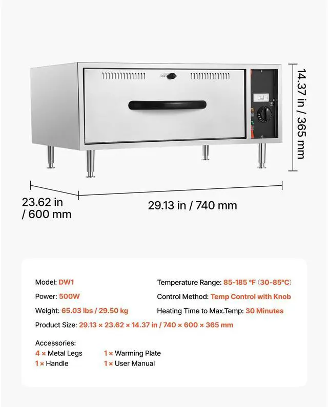 Control Method: Temp Control with Knob,Item Model Number: DW1,Product Weight: 65.03 lbs / 29.50 kg,Temperature Range: 85-185 30-85,Heating Time to Max.Temp: 30 Minutes,Power: 500W,Product Size: 29.13 x 23.62 x 14.37 in / 740 x 600 x 365 mm
