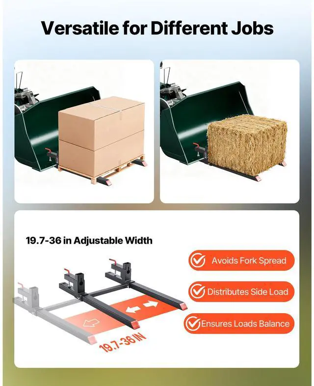 VEVOR Pallet Forks, 2000 lbs Clamp on Pallet Forks, 43-Inch Total Length Heavy-Duty Tractor Fork with Adjustable Stabilizer Bar for Tractor Attachments, Loader Bucket, and Skid Steer, Black