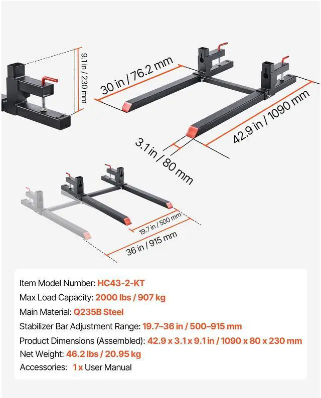 Fork Adjustment Range: 19.736 in / 500915 mm,Item Model Number: HC43-2-KT,Max Load Capacity: 2000 lbs / 907 kg,Product Dimensions (Assembled): 42.9 x 3.1 x 9.1 in / 1090 x 80 x 230 mm,Stabilizer Bar Adjustment Range: 19.736 in / 500915 mm,Net Weight: 46.2 lbs / 20.95 kg,Main Material: Q235B Steel