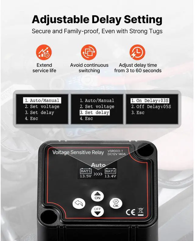 Net Weight (Including All Accessories): 3.5 lbs/1.6 kg,Color: Black,Item Model Number: VSR003-1,Product Dimensions (L x W x H): 3.1 x 2.8 x 2.4 in/80 x 70 x 60 mm,Rated Voltage & Current: DC 12V 140A,Main Material: Plastic PA6 Isolator + Copper Wire