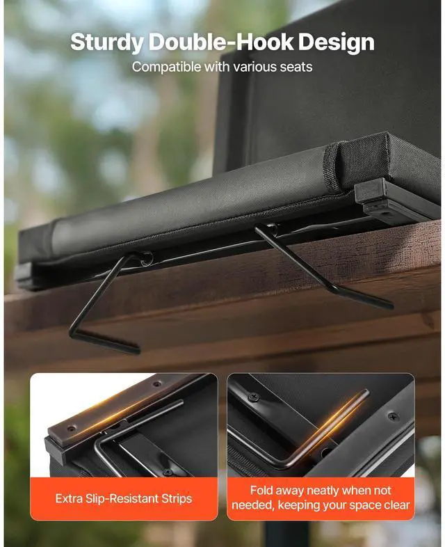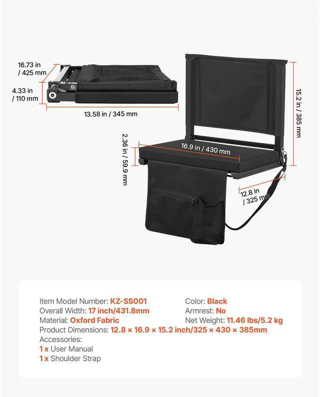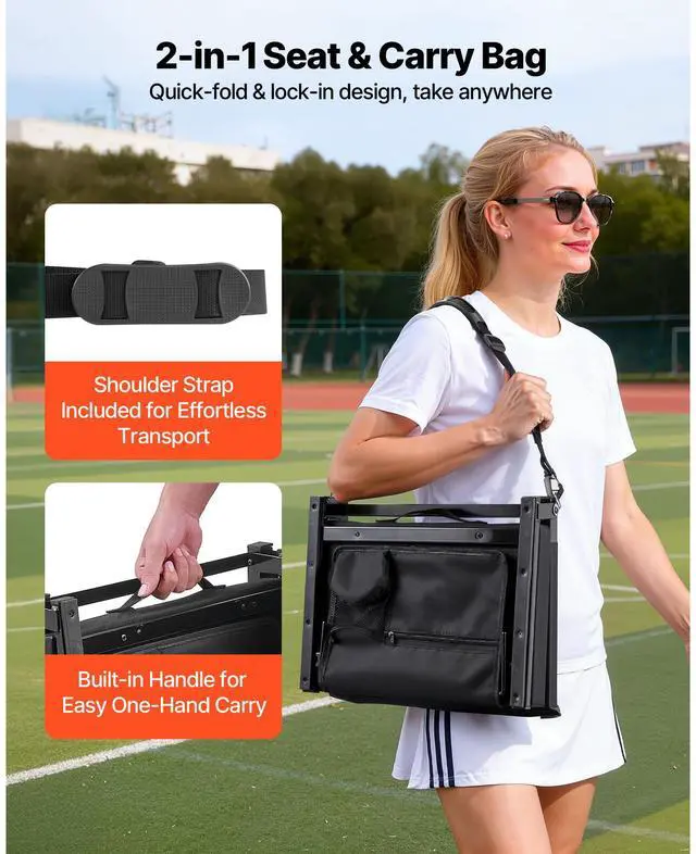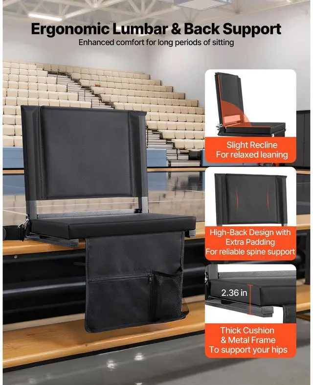 VEVOR Stadium Seat, Folding Bleacher Seat with Back Support and Thick Cushion, Padded Stadium Seats for Bleacher Includes Shoulder Strap, Hooks, Cup Holder, and Side Pocket, Black Bleachers Chair