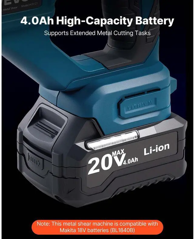 Blade Type: Dual Blades,Motor Voltage: 20 VDC,Housing Material: Nylon,Color: Silver + Blue,Item Model Number: HJ9121-110V,Motor Power: 400 W,Features: Dual-finger pressure-sensitive trigger + safety switch,Item Dimensions: 14.37 x 7.09 x 3.15 in / 365 x 180 x 80 mm,Cutter Head Material: Alloy Tool Steel,Net Weight: 6.48 lbs / 2.94 kg,Max Cutting Capacity: 18 GA Galvanized Steel, 20 GA Stainless Steel,Cutting Head Rotation: 360°