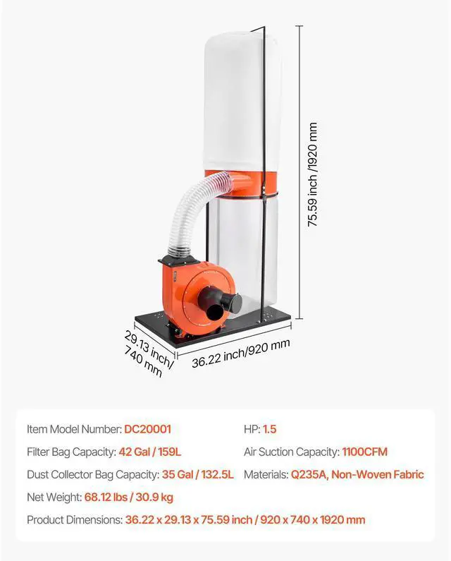 Voltage: AC120V 60Hz,Materials: Q235A, Non-Woven Fabric,Item Model Number: DC20001,HP: 1.5,Filter Bag Capacity: 42 Gal / 159L,Product Dimensions: 36.22 x 29.13 x 75.59 inch / 920 x 740 x 1920 mm,Net Weight: 68.12 lbs / 30.9 kg,Dust Collector Bag Capacity: 35 Gal / 132.5L,Air Suction Capacity: 1100CFM