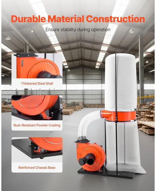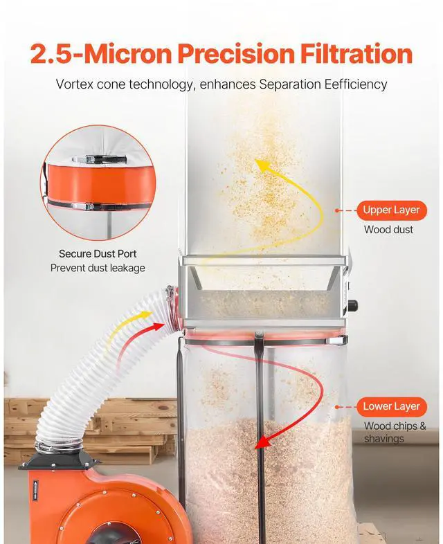 VEVOR Dust Collector, 1100 CFM 2.5 Micron Vortex Cone Dust Collectors, 1.5HP Sawdust Collection System with 35-Gallon Dusts Collector Bag & 42-Gallon Filter Bag, 3400 RPM High Speed, for Woodworking