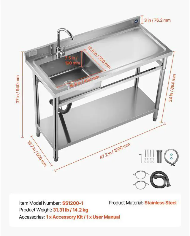 Product Material: Stainless Steel,Item Model Number: SS1200-1,Product Weight: 31.31 lb / 14.2 kg,Product Size: 47.24 x 19.69 x 37.01 inch / 1200 x 500 x 940 mm