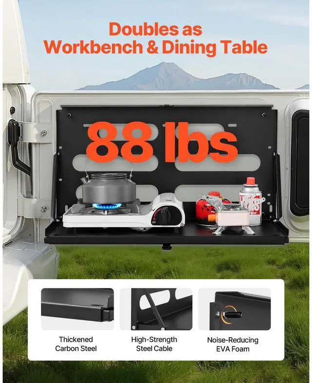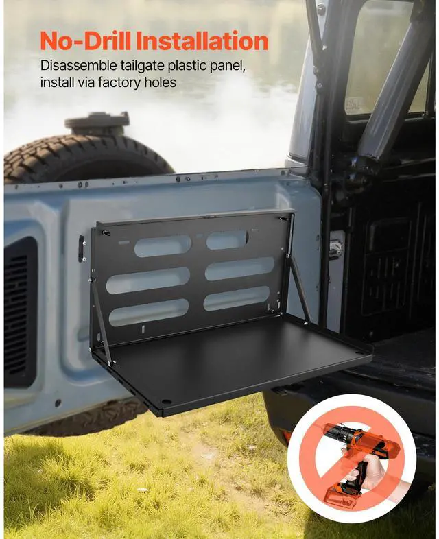 VEVOR Tailgate Table, for 2007-2024 Jeep Wrangler JK, 88 lbs Capacity, Carbon Steel Foldable Molle Panel Drop Down Table, Rear Door Cargo Storage Rack Shelf Luggage Holder Carrier Camping Accessories