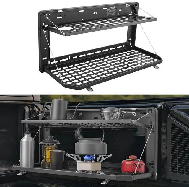 VEVOR Tailgate Table, for 2007-2024 Jeep Wrangler JK, 100 lbs, Carbon Steel Foldable Molle Panel Double-Layer Drop Down Table, Rear Cargo Storage Rack Shelf Luggage Holder Carrier Camping Accessories