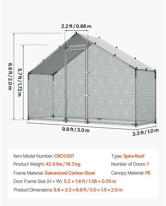 Type: Spire Roof,Door Size /H × W: 5.2 × 1.8 ft /1.58 × 0.55 m,Canopy Material: PE,Item Model Number: CRC0301,Product Weight: 42.6 lbs /19.3 kg,Number of Doors: 1,Frame Material: Galvanized Carbon Steel,Product Dimensions: 9.8 × 3.3 × 6.6 ft /3.0 × 1.0 × 2.0 m