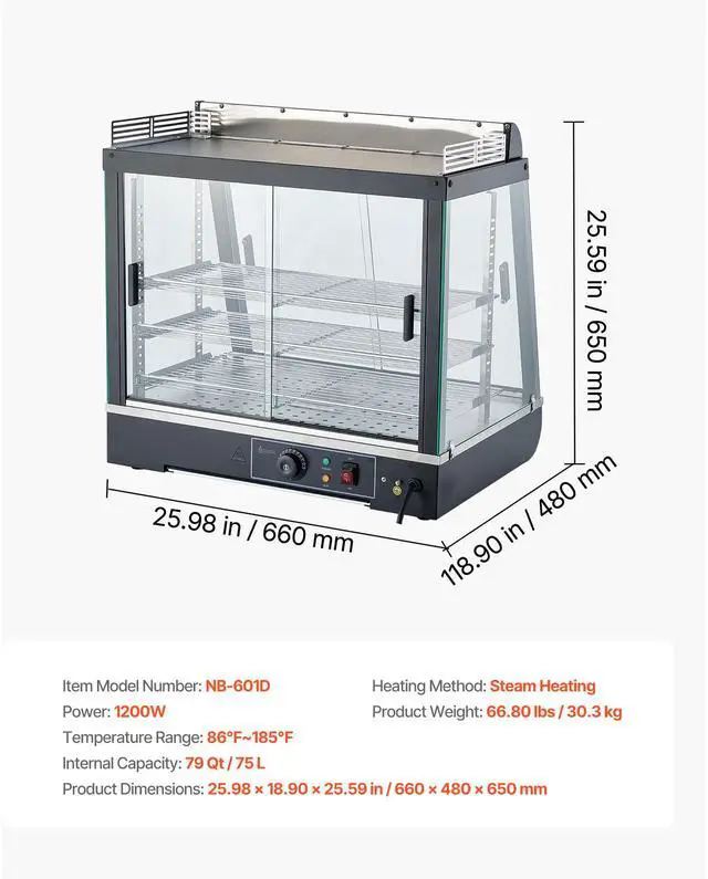 Internal Capacity: 79 Qt / 75 L,Item Model Number: NB-601D,Product Weight: 66.80 lbs / 30.3 kg,Temperature Range: 86~185,Heating Method: Steam Heating,Product Dimensions: 25.98 × 18.90 × 25.59 in / 660 × 480 × 650 mm,Power: 1200W