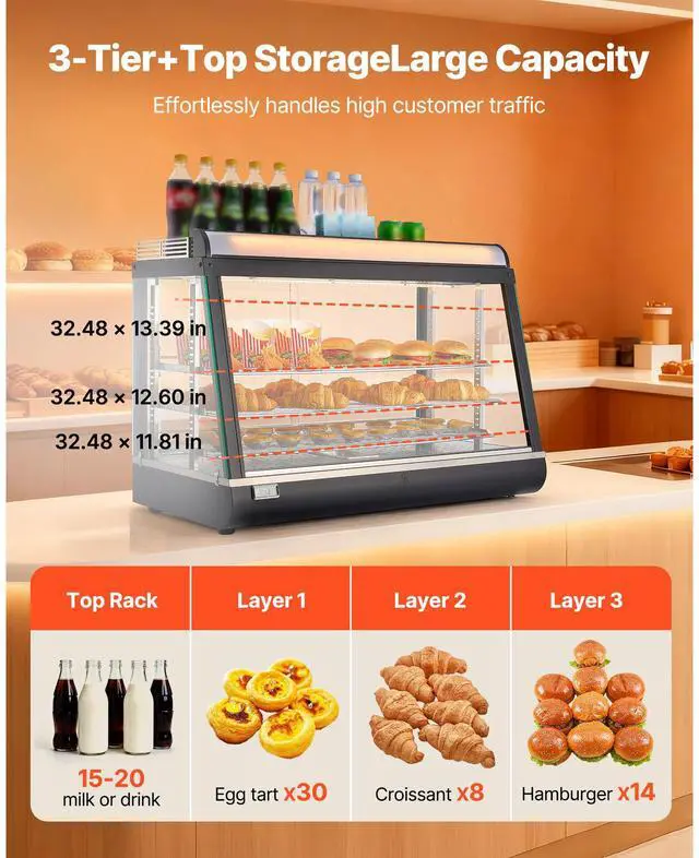 VEVOR 3-Tier Commercial Food Warmer Display, 1400W Food Display Warmer with LED Light, Top Storage and Adjustable Shelves, 86~185 Steam Heating, 105L for Hamburger, Pizza, Bread, Fried Chicken