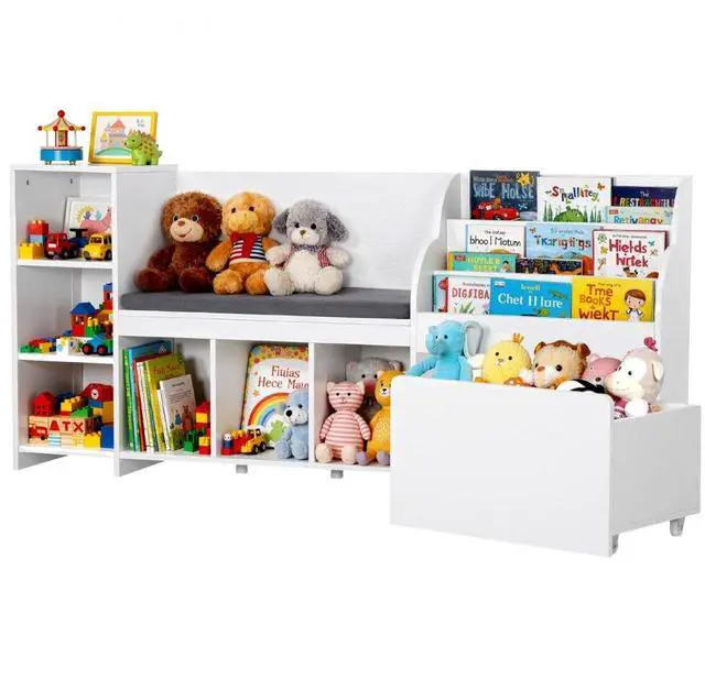 VEVOR Kids Reading Nook, Wooden Storage Bench with Backrest, Kids Bookshelf & Toy Organizer, Large Toy Box Chest for Playroom, Living Room or Entryway, Easy Assembly, 66.9 x 15.8 x 31.5 in, White