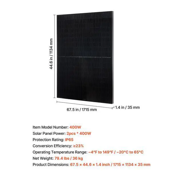 Solar Panel Power: 2pcs * 400W,Conversion Efficiency: 23%,Protection Rating: IP65,Operating Temperature Range: 4°F to 149°F / 20°C to 65°C,Item Model Number: 400W,Product Dimensions: 67.5 x 44.6 x 1.4 inch / 1715 x 1134 x 35 mm,Net Weight: 79.4 lbs / 36 kg