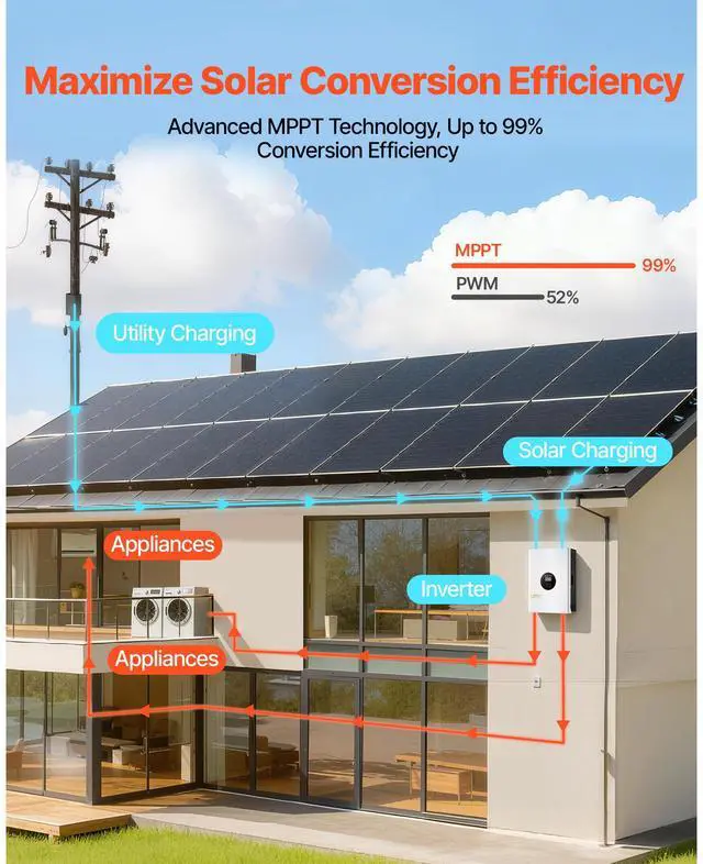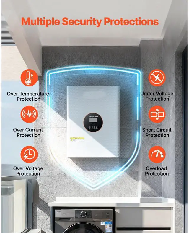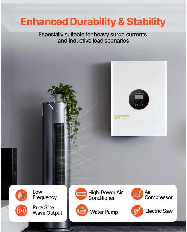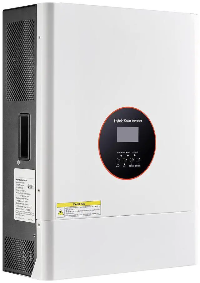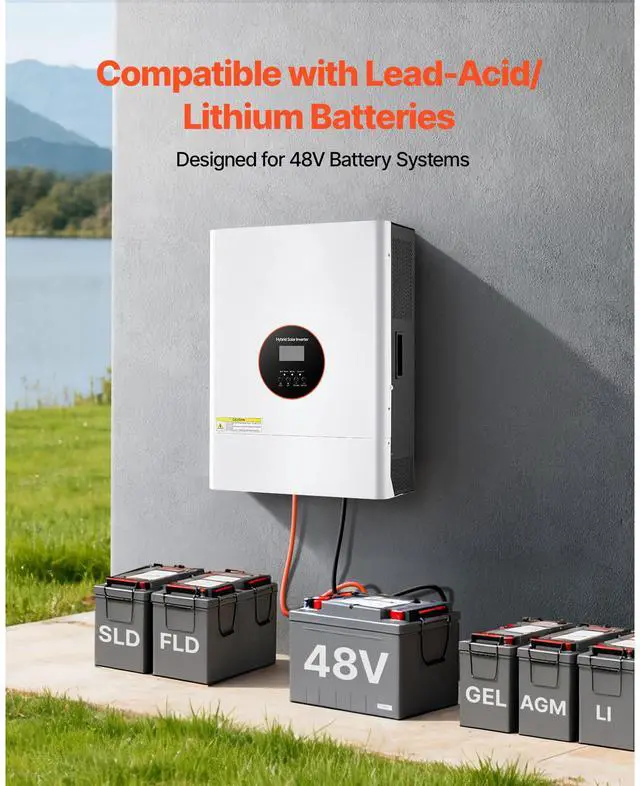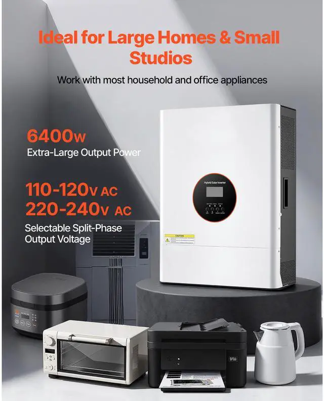 Output Voltage/Frequency: 110120V AC/220240V AC, 60Hz,Compatible Battery Voltage: 48V DC,MPPT Charge Controller: 48V, 120A,Peak Efficiency: 93%,Operating Temperature: 14 to 122 /10 to 50 ,Color: White,Material: Powder-Coated Sheet Metal,Noise Level: 45 dB,Operating Humidity: 20% to 95% RH (non-condensing),Inverter Output Power: 6400W,Item Model Number: VS8048AMN,Compatible Battery Types: Lead-Acid/Lithium Battery,Output Waveform: Pure Sine Wave