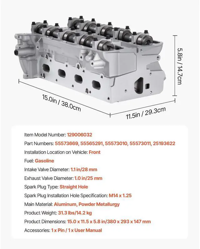 Spark Plug Installation Hole Specification: M14 x 1.25,Spark Plug Type: Straight Hole,Fuel: Gasoline,Item Model Number: 129006032,Product Weight: 31.3 lbs/14.2 kg,Installation Location on Vehicle: Front,Intake Valve Diameter: 1.1 in/28 mm,Product Dimensions: 15.0 x 11.5 x 5.8 in/380 x 293 x 147 mm,Main Material: Aluminum, Powder Metallurgy,Part Numbers: 55573669, 55565291, 55573010, 55573011, 25193622,Exhaust Valve Diameter: 1.0 in/25 mm