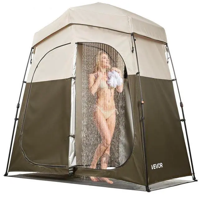 VEVOR Camping Shower Tent, 2-Room Foldable Portable Privacy Tent Changing Room with Ground Stakes, Ropes, and Carry Bag, 150D Oxford Fabric with Silver Coating, for Camping, Beach, and Fishing