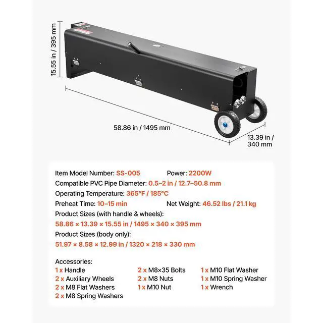 Operating Temperature: 626°F/330°C,Product Sizes (with handle & wheels): 58.86 x 13.39 x 15.55 in/1495 x 340 x 395 mm,Item Model Number: SS-005,Preheat Time: 1015 min,Compatible PVC Pipe Diameter: 0.54 in/12.7101.6 mm,Net Weight: 48.94 lbs / 22.2 kg,Power: 2200W,Product Sizes (body only): 51.97 x 8.58 x 12.99 in/1320 x 218 x 330 mm