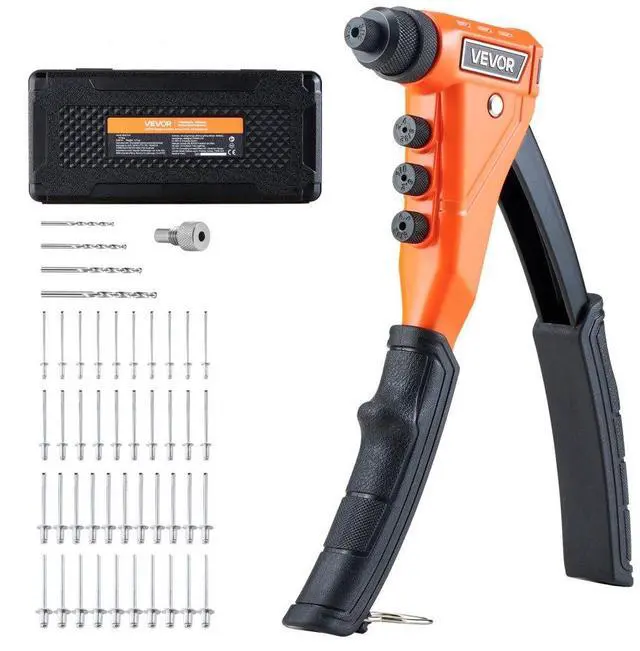 VEVOR Pop Rivet Gun Kit, with 200 Blind Rivets, Heavy Duty Single Hand Riveter with 4 Interchangeable Nosepieces, 4 Drill Bits, and a Carrying Case, Manual Riveting Tool for Metal, Automotive, Home