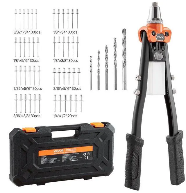 VEVOR Pop Rivet Gun Kit, with 230 Blind Rivets, Two-Handed Riveter with 5 Interchangeable Nosepieces, 5 Drill Bits, and a Carrying Case, Manual Riveting Tool for Metal, Automotive, Home, and DIY