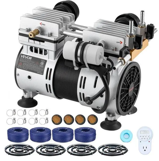VEVOR Pond Aerators, 6.7CFM Aeration System for Lakes up to 3 Acres, 1 HP Air Compressor, 4 Diffusers & Four 100' Weighted Tubing, Outdoor Pond Aeration Pump for Deep Water Oxygen Circulation
