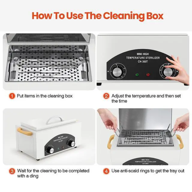 Easy and Safe to OperateOur multi-function cleaning box is easy to use. First, put metal items on the stainless steel tray. Next, adjust the temperature and set the time with the rotary buttons. Then just wait for the cleaning to be done and use anti-scald rings to get the tray out.