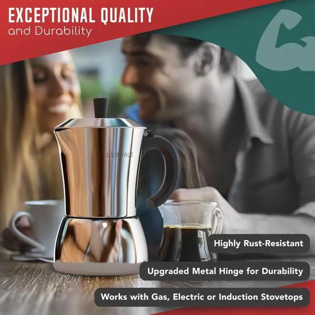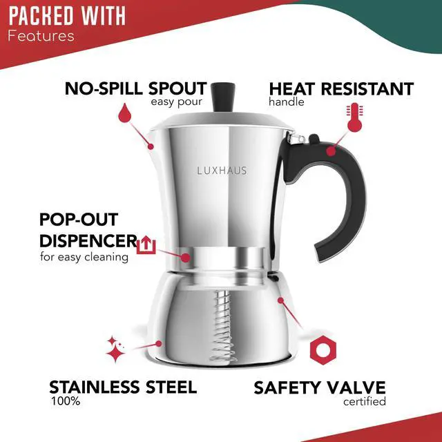 Your health is our #1 priority. We use the highest quality, food-safe, 100% stainless steel for our Italian espresso maker.
