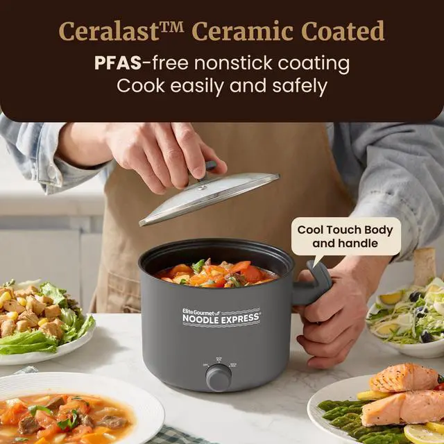 COMPACT, DURABLE, FAST & HOT: 1.25 Qt. capacity for personal-sized meals and a wide variety of foods. The adjustable thermostat features Low for simmering and High for faster cooking, saving you both time and energy. The interior features a food-grade stainless steel core encased in a durable CERALAST PFAS-Free ceramic coating, which protects the heating element and provides chip-resistant, and flake-resistant cooking surface.