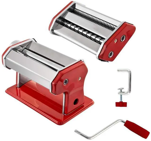 GOURMEX Stainless Steel Manual Pasta Maker Machine | With Adjustable Thickness Settings | Perfect for Professional Homemade Spaghetti and Fettuccini | Includes Removable Handle and Clamp (Silver and Red Colors)
