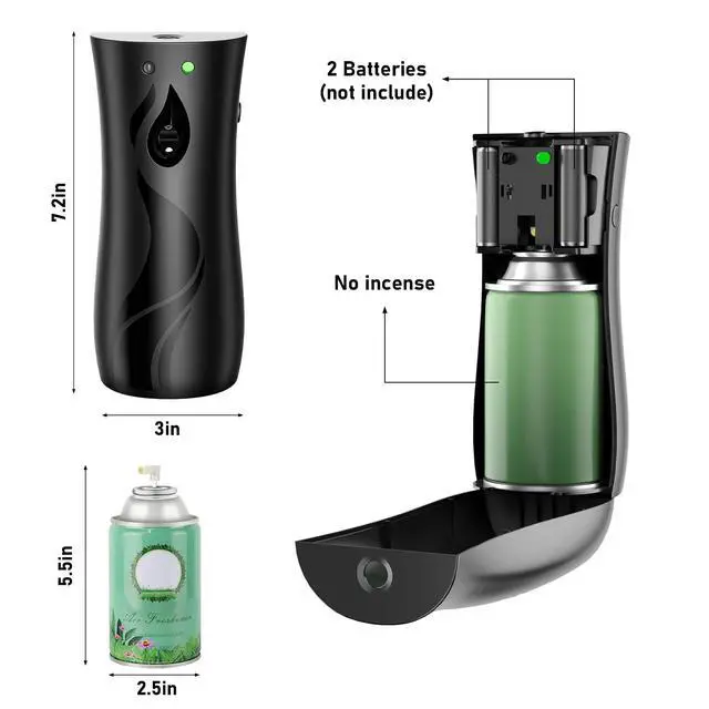This product does not include batteries and does not include fragrance. Upon receipt of the package, you will need to prepare 2 A batteries and the International Standard Size Air Freshener Refill Can (10fl.oz/300ml), 5.51" x 2.56" (not included).