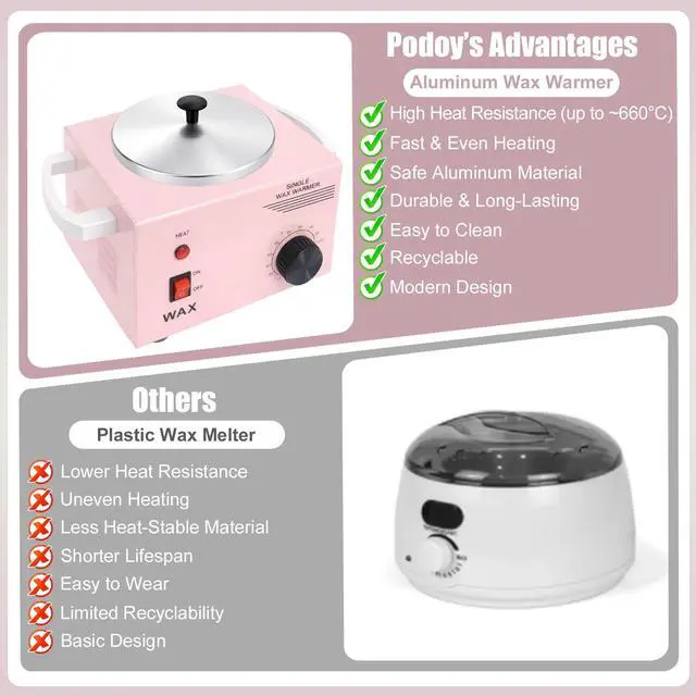 Unlike plastic models, the Podoy professional wax warmer uses a high-strength metal shell with an aluminum pot for superior heat distribution. It withstands long hours of use in salons or at home without warping or cracking. This design ensures steady, even heat for a smoother waxing experience and longer product life.