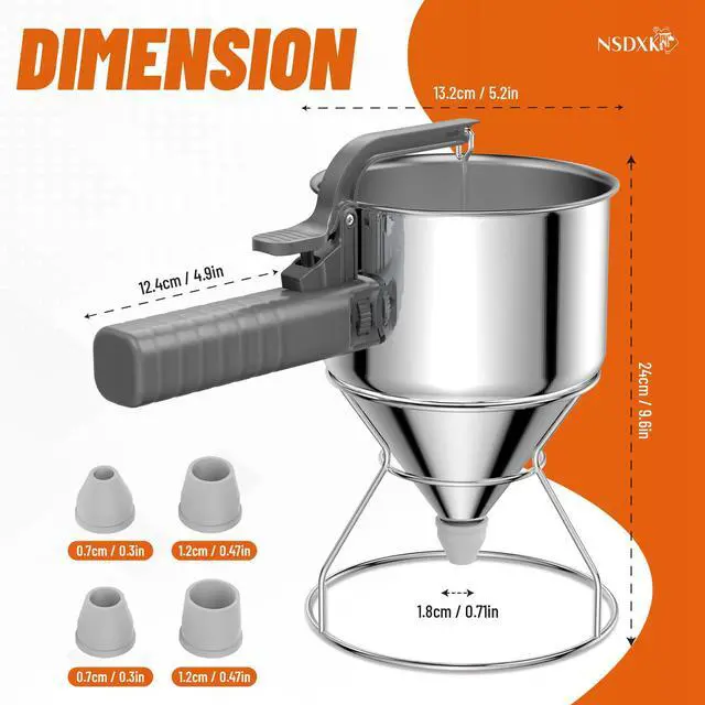 Batter Dispenser Set: You will receive one batter dispenser with a rack, one grip handle, and 4 different-caliber silicone nozzles (sizes: 0.31in, 0.47in, 0.55in, 0.67in). Four different sizes of calibers can help you dispense various types of liquids during baking.