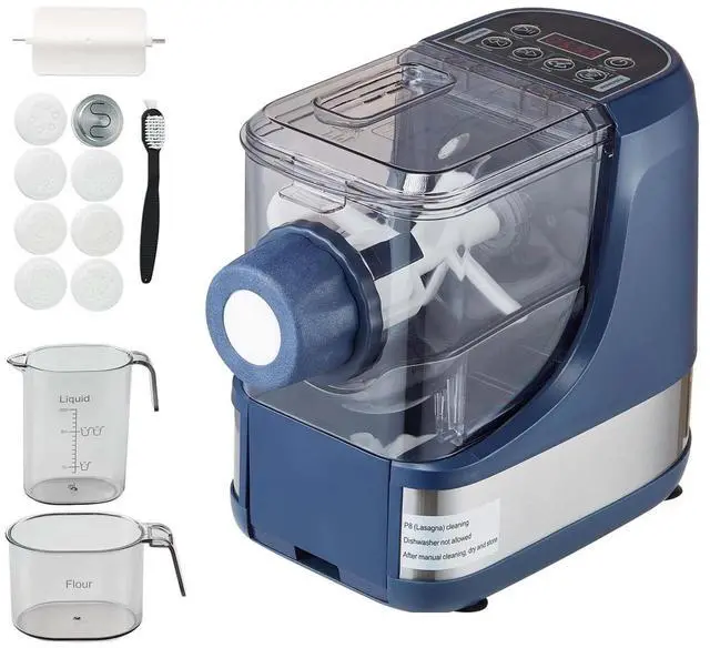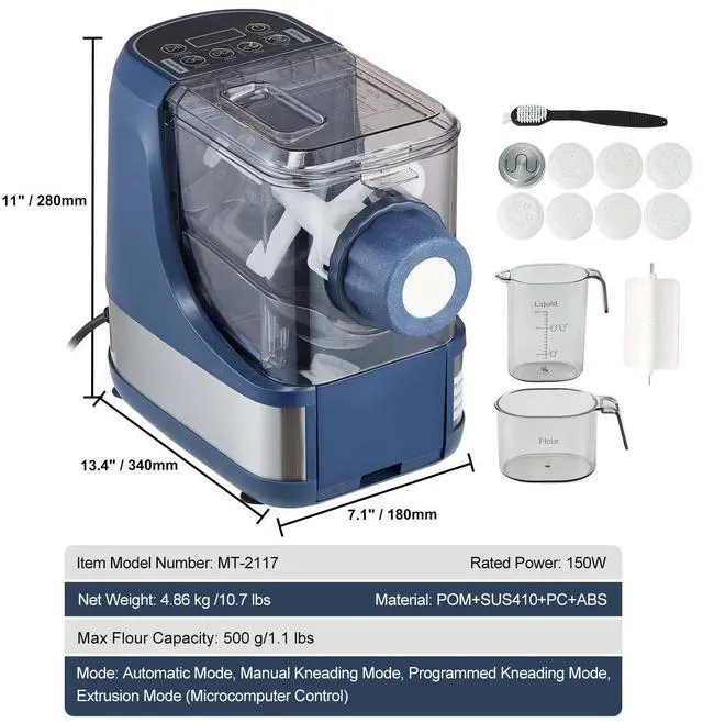 Comprehensive Accessories: In addition to the automatic pasta maker machine, you'll receive a flour measuring cup, a liquid measuring cup, a spatula, a cleaning brush, and eight pasta discs. Detailed instructions are also included, ensuring you have everything you need to unleash your creativity and prepare various fresh, h