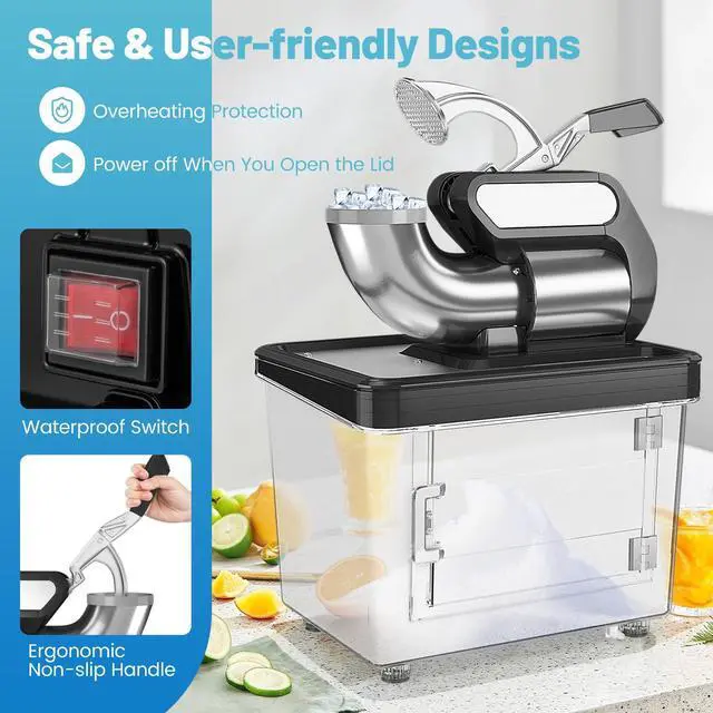 • [Safe & User-friendly Designs]: To ensure users safety, the snow cone maker will automatically stop running when opening the lid, complemented by the waterproof switch and non-slip handle. Moreover, the ice shaver will turn on overheat protection to extend service life when the operating temperatures exceed 266/130.