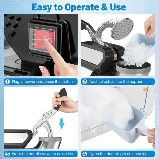 • [Easy to Operate & Use]: Its easy to operate this ice crusher. You just need to plug in power and press the switch, add ice cubes into the hopper, press the handle down to crush ice, and finally open the door to get crushed ice. Besides, after each use, it is also easy to clean the surface.